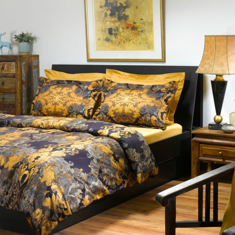 סט מצעים במראה יוקרתי עם דוגמה אתנית יפיפיה בהדפס זהב על רקע שחור בהשראת ארמון המלוכה הספרדי.