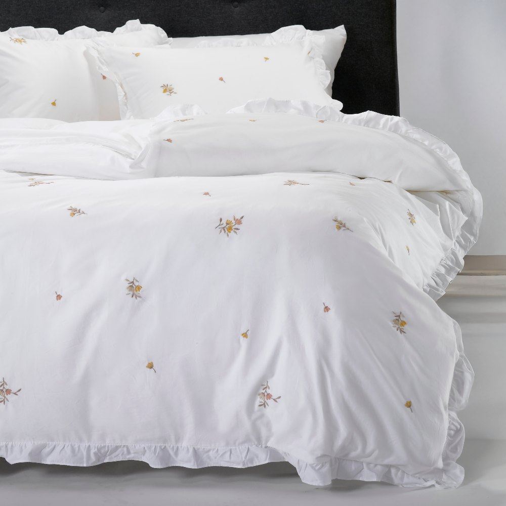 רקמה קטנה של פרחים פזורים על גבי הציפה והציפיות בשילוב מלמלה. סדין לבן חלק.