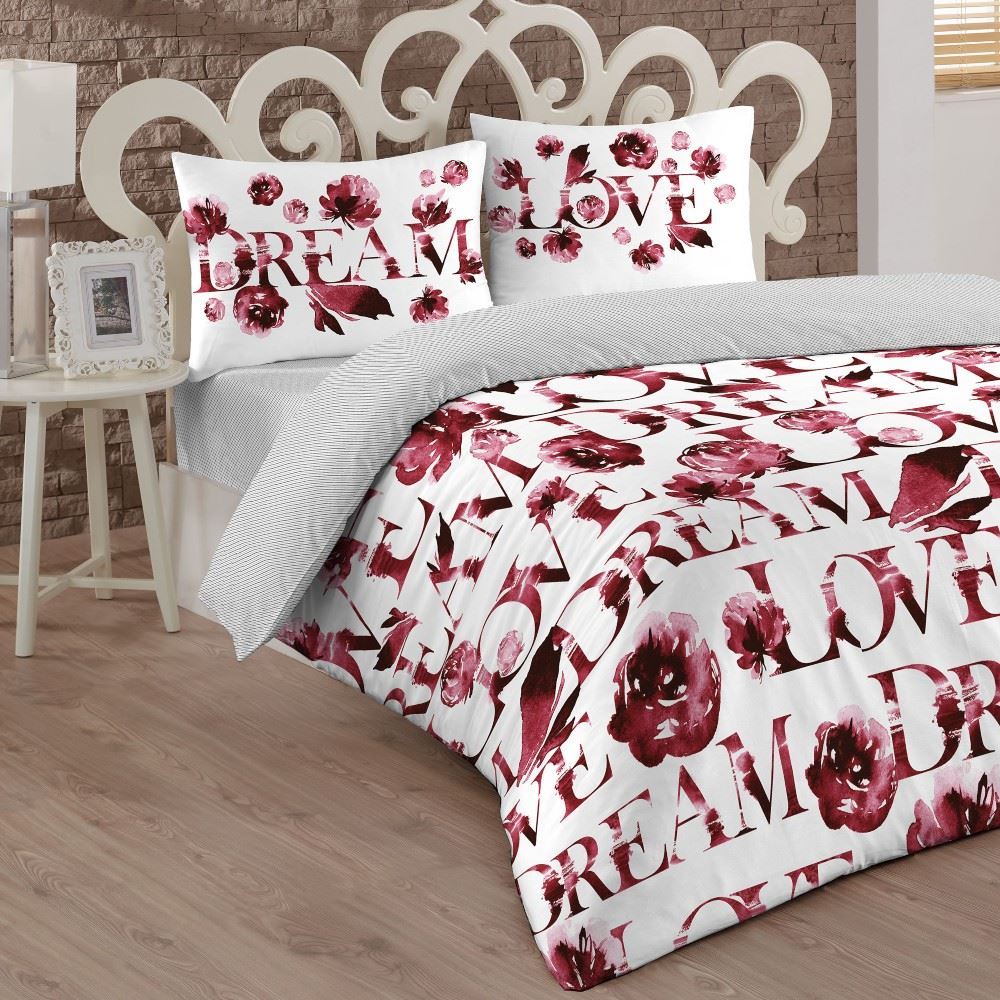Dream & Love בצבעי בורדו רומנטים על רקע לבן. דגם ורד עשוי 100% כותנה סרוקה.
