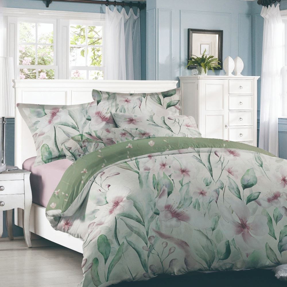 פריחה בגווני ירקרק וורוד עתיק. בד סאטן כ-220 חוטים באינצ' ,מורכב מ- 100% כותנה סרוקה איכותית ונעימה.