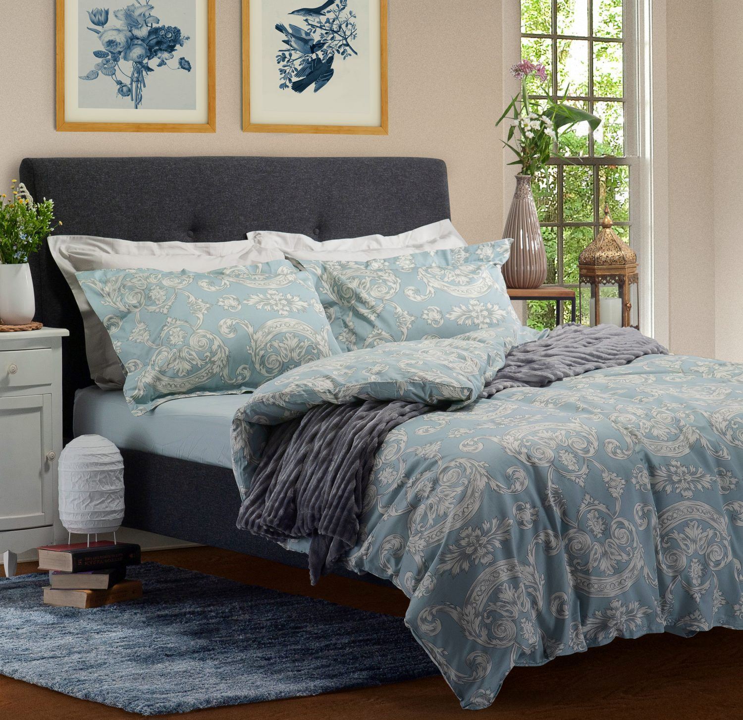סט מצעים דגם פרידה, הוא סט מצעים זוגי קלאסי ויוקרתי בשילוב אורנמנטים עדינים בלבן על רקע תכלת.