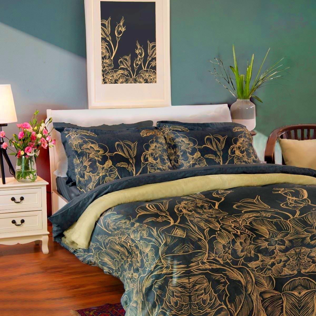 פריחה מטפסת בזהוב על רקע שחור. דגם רומיאו עשוי בד סאטן כ-220 חוטים באינצ' ,מורכב מ- 100% כותנה סרוקה איכותית ונעימה.