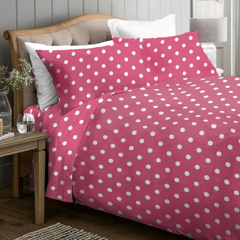 סט מצעים זוגי נעים ומיוחד עשוי 100% כותנה פרקל בצפיפות גבוהה של כ 200 חוטים. עיצוב קלאסי של נקודות לבנות על רקע ורוד. הסט מתאים גם למזרנים גבוהים.
