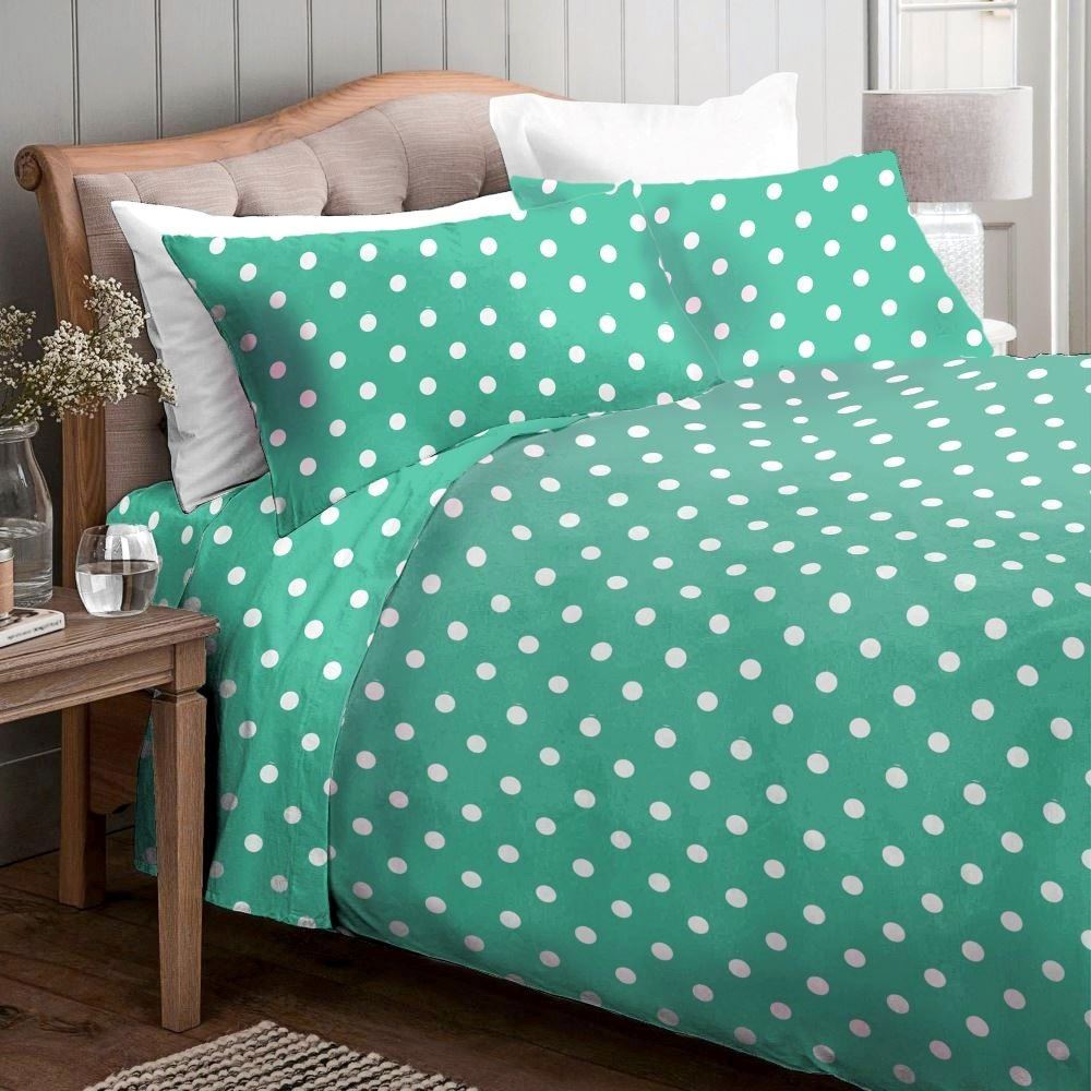 סט מצעים זוגי נעים ומיוחד עשוי 100% כותנה פרקל בצפיפות גבוהה של כ 200 חוטים. עיצוב קלאסי של נקודות לבנות על רקע ירוק. הסט מתאים גם למזרנים גבוהים.