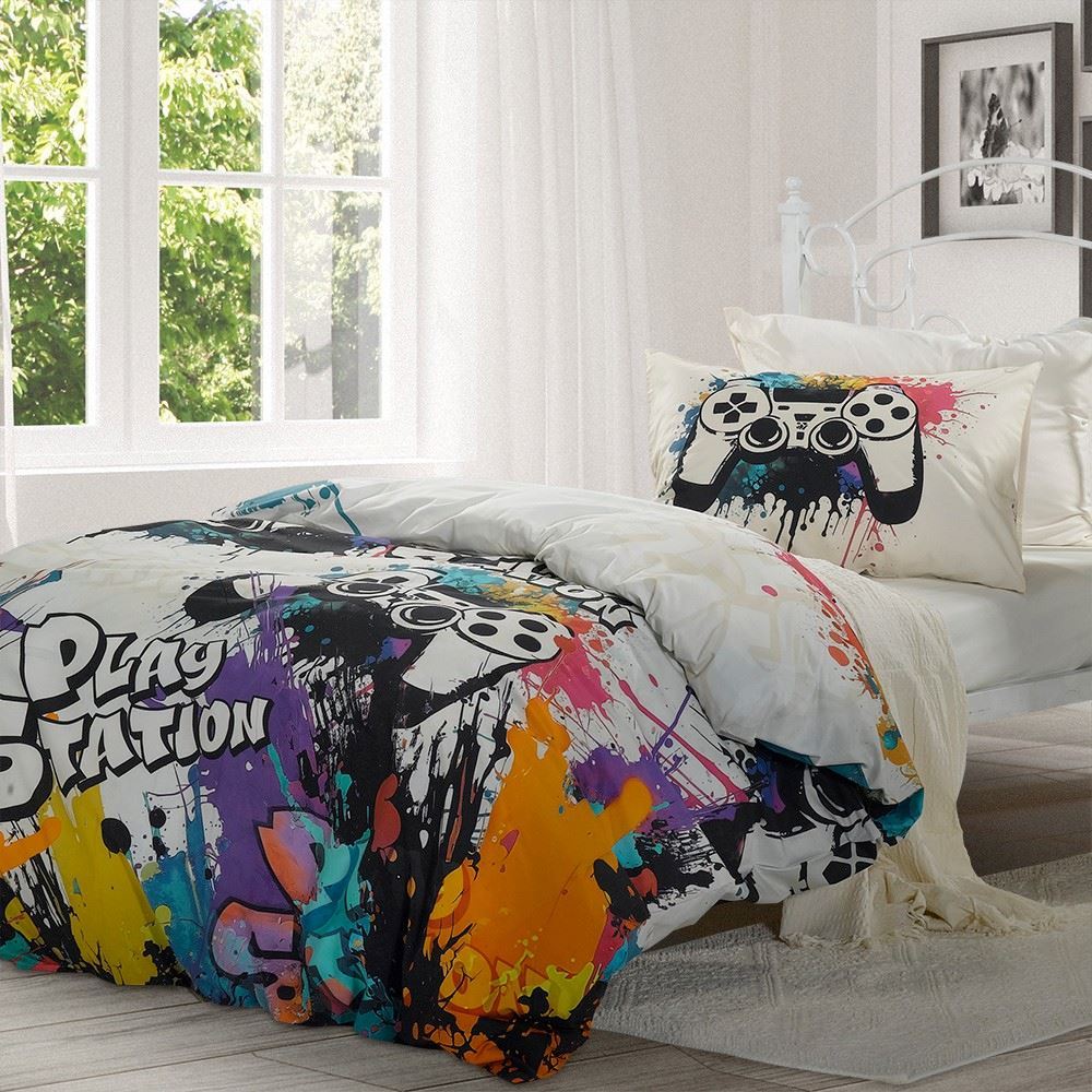 גיימרים ומשחקים מצויירים לילדים. דגם פלייסטיישן עשוי 100% כותנה סרוקה רכה ונעימה.